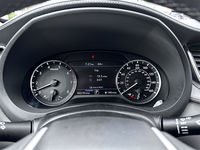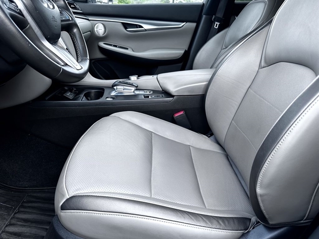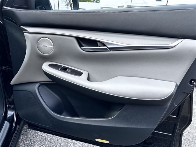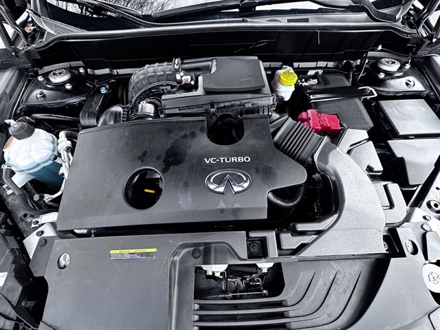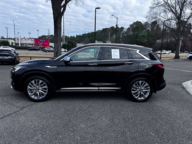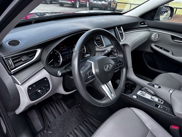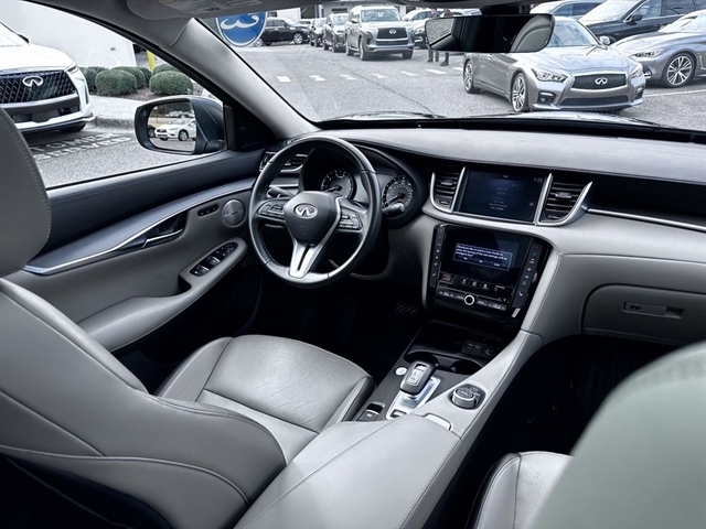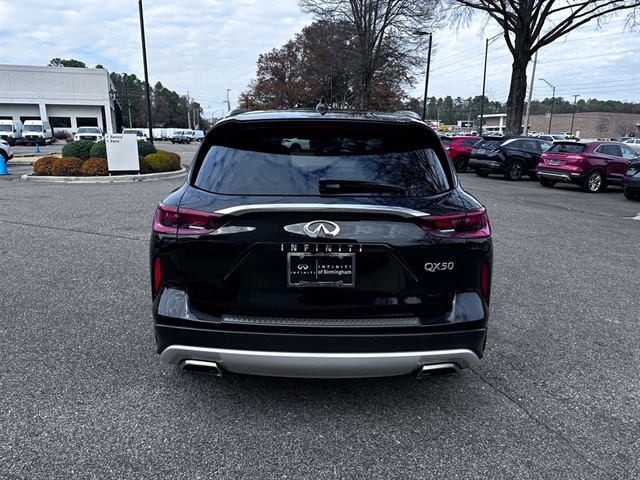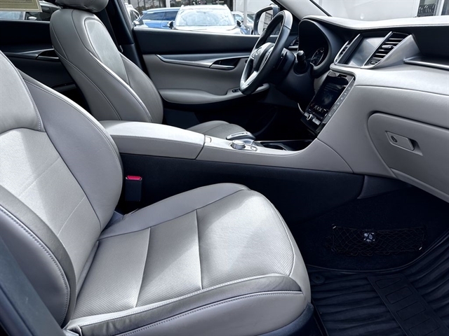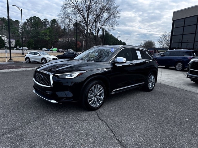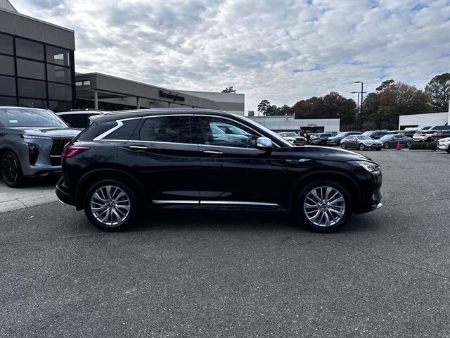 This 2023 INFINITI QX50 LUXE in Black Obsidian comes with the following features: I4 CVT FWD Accent Package, Cargo Package, 4-Wheel Disc Brakes, 5.846 Axle Ratio, 6 Speakers, ABS brakes, Air Conditioning, Alloy wheels, AM/FM radio: SiriusXM, Auto High-beam Headlights, Auto-dimming Rear-View mirror, Automatic temperature control, Bose 12-Speaker Premium Audio, Brake assist, Bumpers: body-color, CD player, Delay-off headlights, Driver door bin, Driver vanity mirror, Dual front impact airbags, Dual front side impact airbags, Electronic Stability Control, Emergency communication system: INFINITI InTouch (1-year complimentary trial), Exterior Parking Camera Rear, Floor Mats, Four wheel independent suspension, Front anti-roll bar, Front Bucket Seats, Front Center Armrest, Front dual zone A/C, Front reading lights, Fully automatic headlights, Garage door transmitter: HomeLink, Heated door mirrors, Heated Front Bucket Seats, Heated front seats, Illuminated entry, Illuminated Kick Plates, Knee airbag, Leather Shift Knob, Leather steering wheel, Leather-Appointed Seat Trim, Literature Kit, Low tire pressure warning, Memory seat, Occupant sensing airbag, Outside temperature display, Overhead airbag, Overhead console, Panic alarm, Passenger door bin, Passenger vanity mirror, Power door mirrors, Power driver seat, Power Liftgate, Power moonroof, Power passenger seat, Power steering, Power windows, Radio data system, Radio: HD Audio System, Rear anti-roll bar, Rear Bumper Protector, Rear Parking Sensors, Rear reading lights, Rear seat center armrest, Rear side impact airbag, Rear window defroster, Rear window wiper, Remote keyless entry, Security system, Speed control, Speed-sensing steering, Speed-Sensitive Wipers, Splash Guards (Set of 4), Split folding rear seat, Spoiler, Steering wheel mounted audio controls, Tachometer, Telescoping steering wheel, Tilt steering wheel, Traction control, Trip computer, Turn signal indicator mirrors, USB Charging Cable Set, Variably intermittent wipers, Welcome Lighting w/Logo, and Wheels: 19`` Silver Painted Aluminum Alloy.