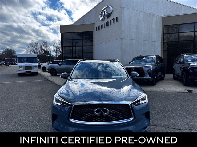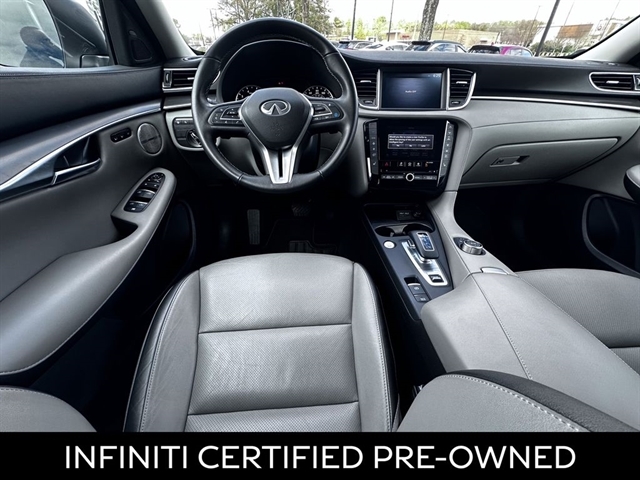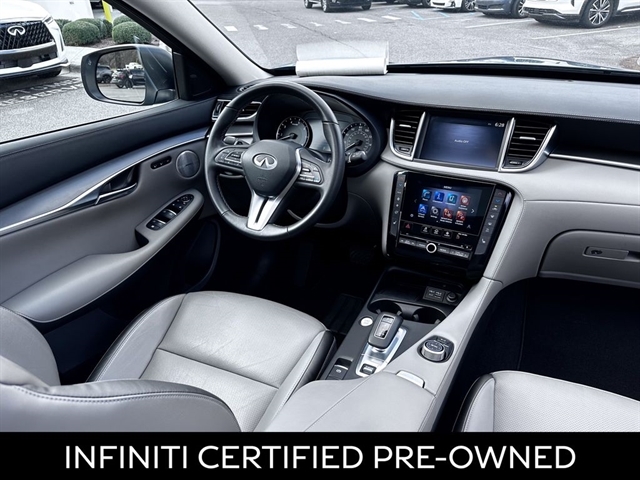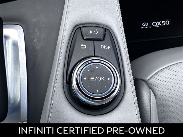 This 2024 INFINITI QX50 LUXE in Slate Gray comes with the following features: I4 CVT FWD ***Manager Special - PRICE NOT A MISPRINT - THIS MONTH ONLY!!*, *Back Up Warning Sensors*, *Blind Spot Technology - Never Worry When Changing Lanes Again*, *Panoramic Moonroof*, *Rear View Back-Up Camera*, and *We Deliver Anywhere* 4-Wheel Disc Brakes, 5.846 Axle Ratio, 6 Speakers, ABS brakes, Air Conditioning, Alloy wheels, AM/FM radio: SiriusXM, Auto High-beam Headlights, Auto-dimming Rear-View mirror, Automatic temperature control, Bose 12-Speaker Premium Audio, Brake assist, Bumpers: body-color, CD player, Delay-off headlights, Driver door bin, Driver vanity mirror, Dual front impact airbags, Dual front side impact airbags, Electronic Stability Control, Emergency communication system: INFINITI InTouch (1-year complimentary trial), Exterior Parking Camera Rear, Floor Mats, Four wheel independent suspension, Front anti-roll bar, Front Bucket Seats, Front Center Armrest, Front dual zone A/C, Front reading lights, Fully automatic headlights, Garage door transmitter: HomeLink, Heated door mirrors, Heated Front Bucket Seats, Heated front seats, Illuminated entry, Knee airbag, Leather Shift Knob, Leather steering wheel, Leather-Appointed Seat Trim, Literature Kit, Low tire pressure warning, Memory seat, Occupant sensing airbag, Outside temperature