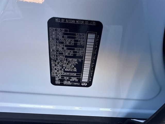 ***Manager Special - PRICE NOT A MISPRINT - THIS MONTH ONLY!!*, *Back Up Warning Sensors*, *Blind Spot Technology - Never Worry When Changing Lanes Again*, *Bluetooth Hands-Free Calling*, *Bought Here, Serviced Here, We Have All Records!*, *Factory Certified Pre-owned Vehicle!*, *Moonroof*, *Push Button Start*, *We Deliver Anywhere*, 6 Speakers, Auto High-beam Headlights, Auto-dimming Rear-View mirror, Automatic temperature control, Black Film Rear Bumper Protector, Black Splash Guards (Set of 4), Cargo Net, Cargo Package, CD player, Delay-off headlights, Driver vanity mirror, Dual front impact airbags, Dual front side impact airbags, Emergency communication system: INFINITI InTouch, Exterior Parking Camera Rear, Front dual zone A/C, Front fog lights, Fully automatic headlights, Garage door transmitter: HomeLink, Heated door mirrors, Heated front seats, Illuminated entry, Knee airbag, Low tire pressure warning, Occupant sensing airbag, Outside temperature display, Overhead airbag, Overhead console, Panic alarm, Passenger vanity mirror, Power door mirrors, Power driver seat, Power Liftgate, Power moonroof, Power passenger seat, Radio data system, Radio: AM/FM Audio System, Rear Parking Sensors, Rear side impact airbag, Rear window defroster, Rear window wiper, Remote keyless entry, Reversible Cargo Mat, Security system, Speed control, Speed-sensing steering, Speed-Sensitive Wipers, Steering wheel mounted audio controls, Tachometer, Telescoping steering wheel, Tilt steering wheel, Traction control, Trip computer, Turn signal indicator mirrors, Variably intermittent wipers, Wheels: 20`` x 8.5`` Machine Finished Aluminum Alloy.