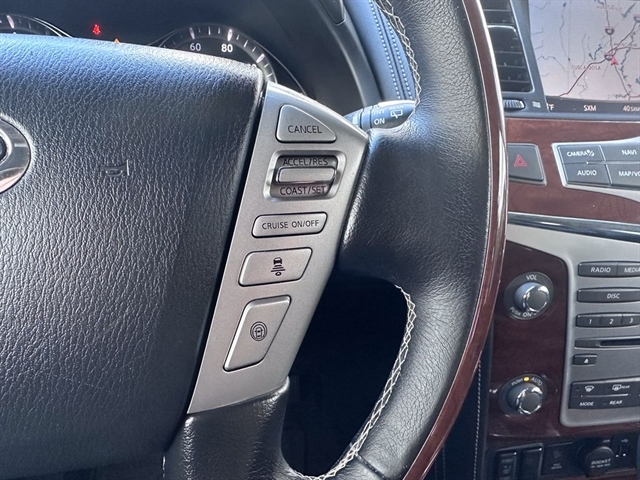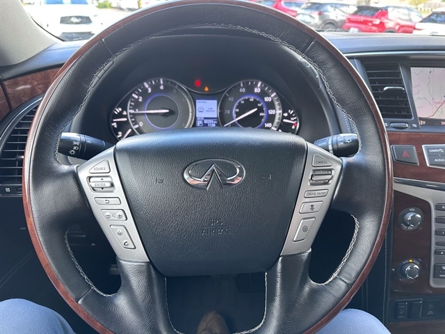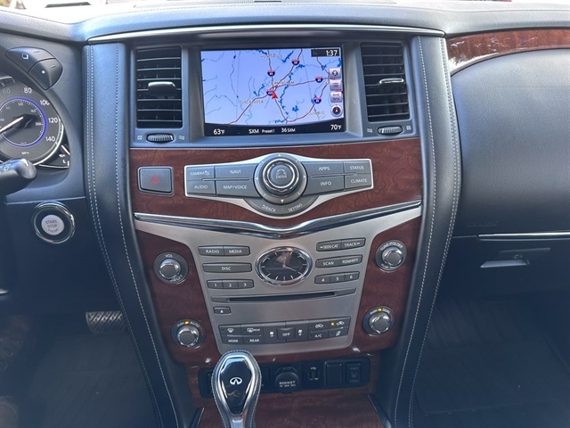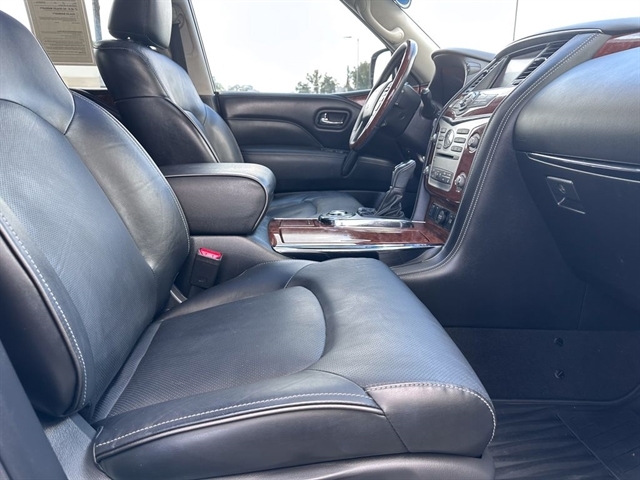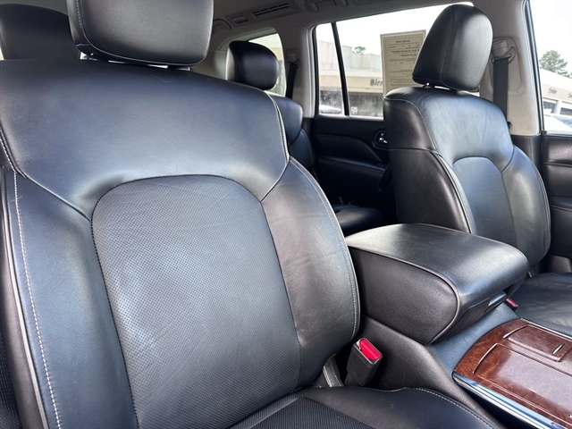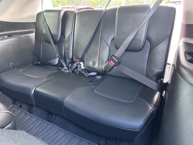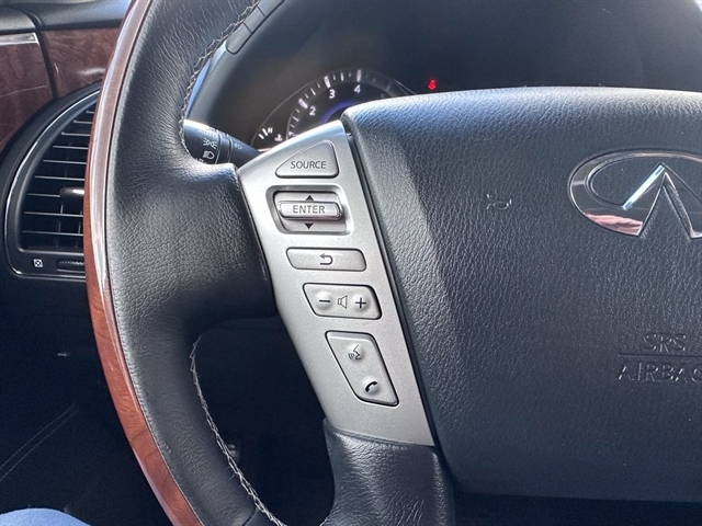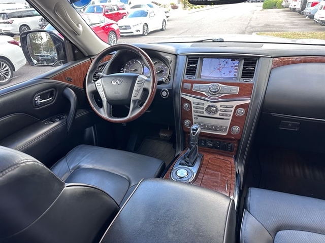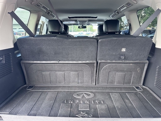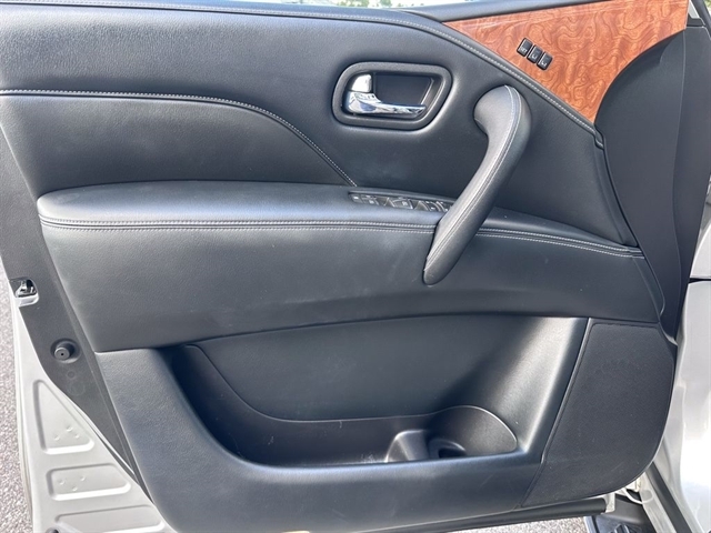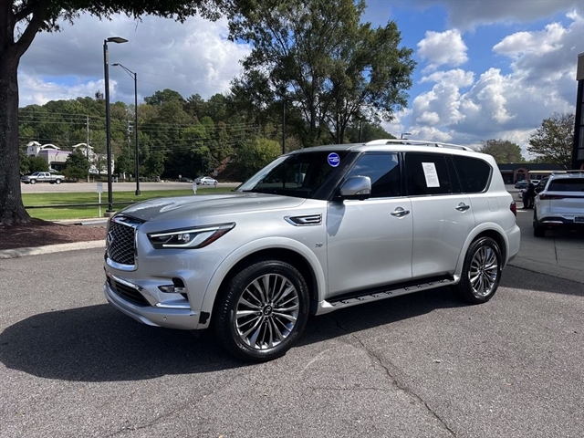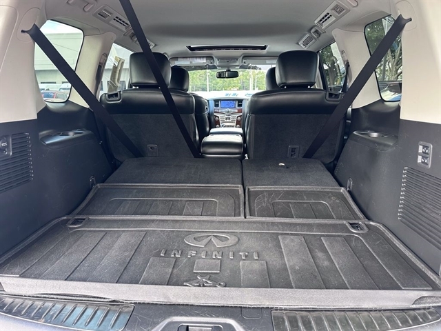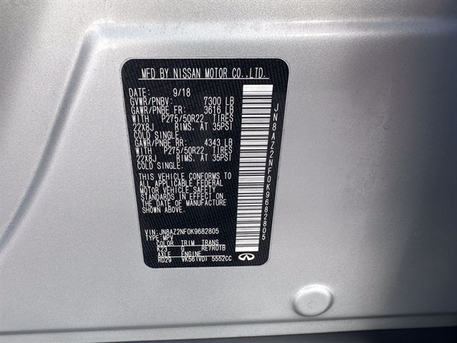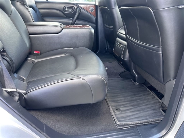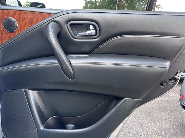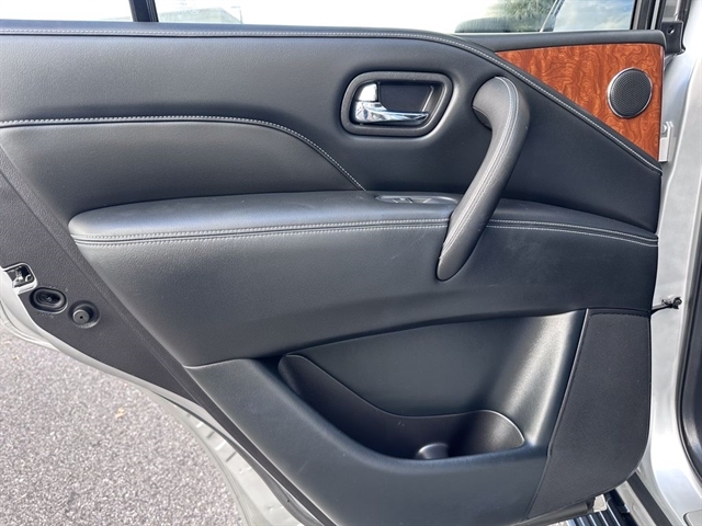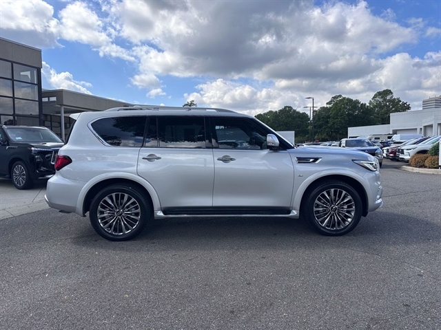 This 2019 INFINITI QX80 LUXE in Liquid Platinum comes with the following features: 5.6L V8 7-Speed Automatic RWD 22`` Wheel Package (Wheels: 22`` x 8.0`` 14-Spoke Forged Aluminum-Alloy), All-Season Package (All-Season Floor Mats and Cargo Area Mat), Cargo Package (First-Aid Kit, High-Density Non-Slip Rear Cargo Carpet, and Nylon-Cord Cargo Net), ProASSIST Package (Backup Collision Intervention (BCI), Blind Spot Intervention (BSI), Blind Spot Warning, Intelligent Cruise Control (Full-Speed Range), and Lane Departure Warning System), 13 Speakers, 2.94 Axle Ratio, 3rd row seats: split-bench, 4-Wheel Disc Brakes, ABS brakes, Air Conditioning, Alloy wheels, AM/FM radio: SiriusXM, Anti-whiplash front head restraints, Auto High-beam Headlights, Auto tilt-away steering wheel, Auto-dimming door mirrors, Auto-dimming Rear-View mirror, Auto-leveling suspension, Automatic temperature control, Brake assist, Bumpers: body-color, CD player, Delay-off headlights, Driver door bin, Driver vanity mirror, Dual front impact airbags, Dual front side impact airbags, DVD-Audio, Electronic Stability Control, Emergency communication system: INFINITI Connection, Four wheel independent suspension, Front anti-roll bar, Front Bucket Seats, Front Center Armrest, Front dual zone A/C, Front fog lights, Front reading lights, Fully automatic headlights, Garage door transmitter: HomeLink, Genuine wood console insert, Genuine wood dashboard insert, Genuine wood door panel insert, Heated door mirrors, Heated Front Bucket Seats, Heated front seats, Heated steering wheel, Illuminated entry, INFINITI Radiant Welcome Lighting, Leather Shift Knob, Leather steering wheel, Leather-Appointed Seats w/Stratford Burl Trim, Literature Kit, Low tire pressure warning, Memory seat, Navigation system: INFINITI InTouch Navigation, Occupant sensing airbag, Outside temperature display, Overhead airbag, Overhead console, Panic alarm, Passenger door bin, Passenger vanity mirror, Power door mirrors, Power driver seat, Power Liftgate, Power moonroof, Power passenger seat, Power steering, Power windows, Radiant Illuminated Kick Plates, Radio data system, Radio: AM/FM/HD w/Single In-Dash CD/DVD Player & MP3, Rain sensing wipers, Rear air conditioning, Rear anti-roll bar, Rear audio controls, Rear reading lights, Rear seat center armrest, Rear window defroster, Rear window wiper, Reclining 3rd row seat, Remote keyless entry, Roof rack: rails only, Roof Rail Cross Bars, Security system, Speed control, Speed-sensing steering, Split folding rear seat, Spoiler, Steering wheel memory, Steering wheel mounted audio controls, Tachometer, Telescoping steering wheel, Tilt steering wheel, Traction control, Trip computer, Turn signal indicator mirrors, Variably intermittent wipers, Voltmeter, and Wheels: 20`` x 8.0`` Aluminum-Alloy.