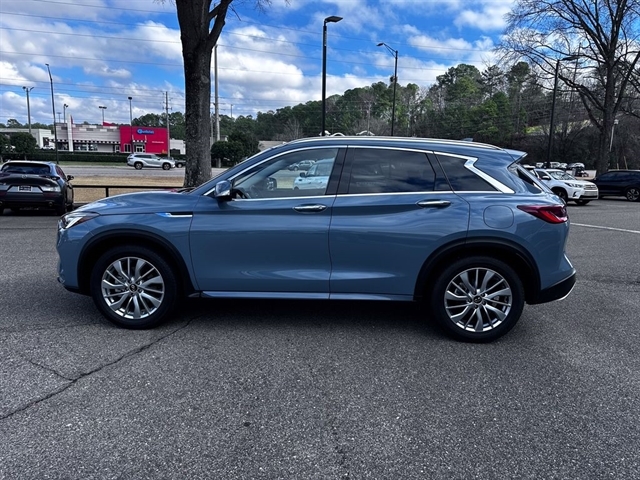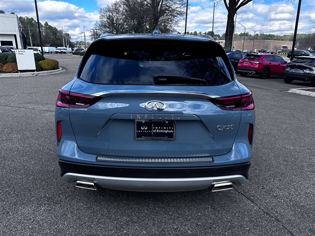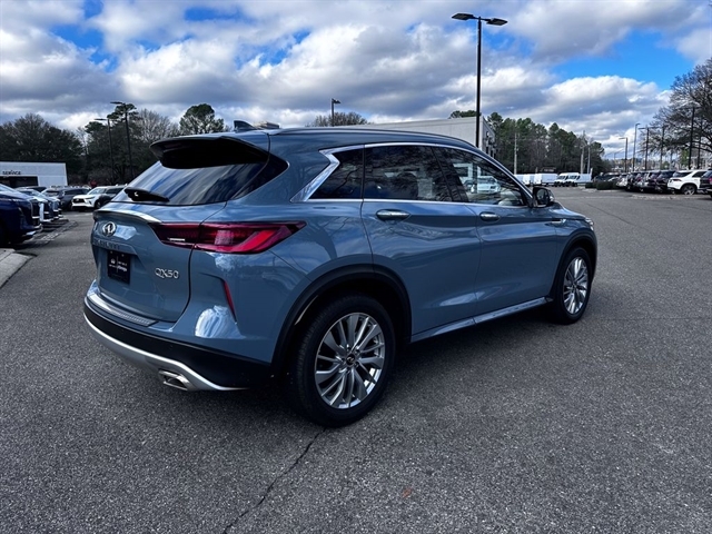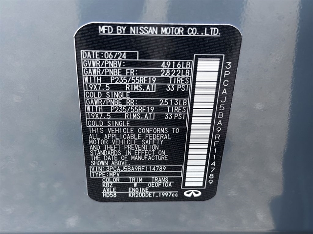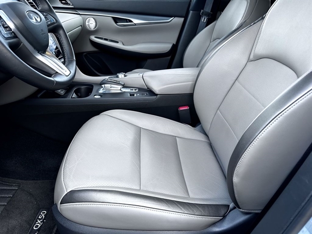 This 2024 INFINITI QX50 LUXE in Slate Gray comes with the following features: I4 CVT FWD ***Manager Special - PRICE NOT A MISPRINT - THIS MONTH ONLY!!*, *Back Up Warning Sensors*, *Blind Spot Technology - Never Worry When Changing Lanes Again*, *Panoramic Moonroof*, *Rear View Back-Up Camera*, and *We Deliver Anywhere* Auto High-beam Headlights, Auto-dimming Rear-View mirror, Bose 12-Speaker Premium Audio, Brake assist, Emergency communication system: INFINITI InTouch (1-year complimentary trial), Exterior Parking Camera Rear, Front dual zone A/C, Garage door transmitter: HomeLink, Heated door mirrors, Heated Front Bucket Seats, Illuminated entry, Power door mirrors, Power Liftgate, Power moonroof, Rear Parking Sensors, Remote keyless entry, Speed-Sensitive Wipers, Telescoping steering wheel, Turn signal indicator mirrors, and Wheels: 19`` Silver Painted Aluminum Alloy INFINITI Certified Pre-Owned Certified, Auto High-beam Headlights, Auto-dimming Rear-View mirror, Bose 12-Speaker Premium Audio, Brake assist, Emergency communication system: INFINITI InTouch (1-year complimentary trial), Exterior Parking Camera Rear, Front dual zone A/C, Garage door transmitter: HomeLink, Heated door mirrors, Heated Front Bucket Seats, Illuminated entry, Power door mirrors, Power Liftgate, Power moonroof, Rear Parking Sensors, Remote keyless entry, Speed-Sensitive Wipers, Telescoping steering wheel, Turn signal indicator mirrors, Wheels: 19`` Silver Painted Aluminum Alloy, 4-Wheel Disc Brakes, 5.846 Axle Ratio, 6 Speakers, ABS brakes, Air Conditioning, Alloy wheels, AM/FM radio: SiriusXM, Automatic temperature control, Bumpers: body-color, CD player, Delay-off headlights, Driver door bin, Driver vanity mirror, Dual front impact airbags, Dual front side impact airbags, Electronic Stability Control, Floor Mats, Four wheel independent suspension, Front anti-roll bar, Front Bucket Seats, Front Center Armrest, Front reading lights, Fully automatic headlights, Heated front seats, Knee airbag, Leather Shift Knob, Leather steering wheel, Leather-Appointed Seat Trim, Literature Kit, Low tire pressure warning, Memory seat, Occupant sensing airbag, Outside temperature display, Overhead airbag, Overhead console, Panic alarm, Passenger door bin, Passenger vanity mirror, Power driver seat, Power passenger seat, Power steering, Power windows, Radio data system, Radio: HD Audio System, Rear anti-roll bar, Rear Bumper Protector, Rear reading lights, Rear seat center armrest, Rear side impact airbag, Rear window defroster, Rear window wiper, Security system, Special Paint - Slate Gray, Speed control, Speed-sensing steering, Split folding rear seat, Spoiler, Steering