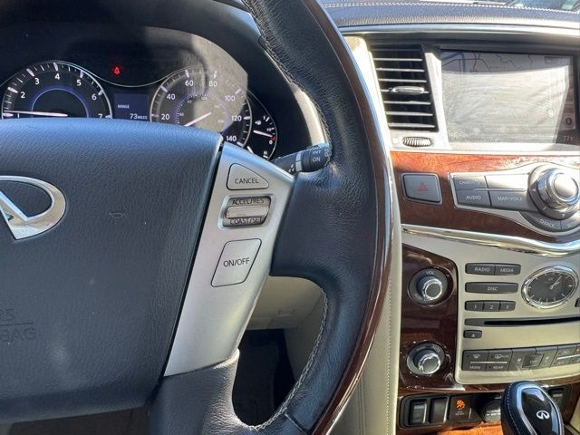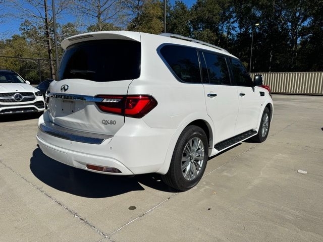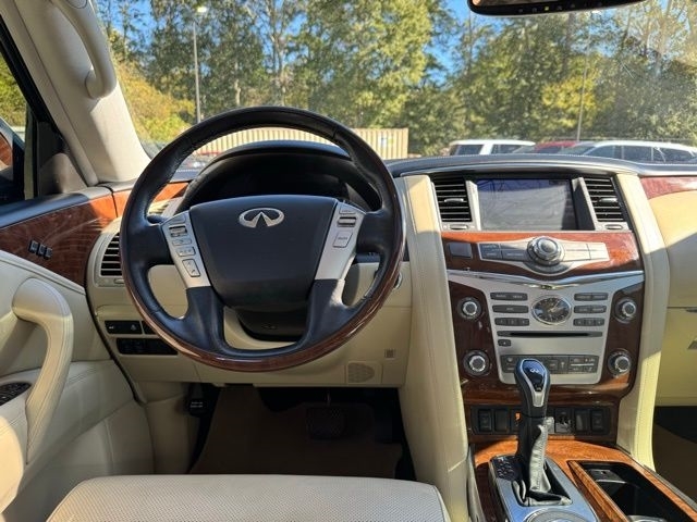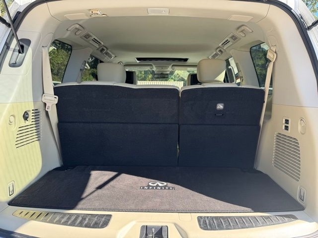 This 2019 INFINITI QX80 LUXE in Moonstone White comes with the following features: 5.6L V8 7-Speed Automatic RWD Cargo Package (First-Aid Kit, High-Density Non-Slip Rear Cargo Carpet, and Nylon-Cord Cargo Net), 13 Speakers, 2.94 Axle Ratio, 3rd row seats: split-bench, 4-Wheel Disc Brakes, ABS brakes, Air Conditioning, Alloy wheels, AM/FM radio: SiriusXM, Anti-whiplash front head restraints, Auto High-beam Headlights, Auto tilt-away steering wheel, Auto-dimming door mirrors, Auto-dimming Rear-View mirror, Auto-leveling suspension, Automatic temperature control, Brake assist, Bumpers: body-color, CD player, Delay-off headlights, Driver door bin, Driver vanity mirror, Dual front impact airbags, Dual front side impact airbags, DVD-Audio, Electronic Stability Control, Emergency communication system: INFINITI Connection, Four wheel independent suspension, Front anti-roll bar, Front Bucket Seats, Front Center Armrest, Front dual zone A/C, Front fog lights, Front reading lights, Fully automatic headlights, Garage door transmitter: HomeLink, Genuine wood console insert, Genuine wood dashboard insert, Genuine wood door panel insert, Heated door mirrors, Heated Front Bucket Seats, Heated front seats, Heated steering wheel, Illuminated entry, INFINITI Radiant Welcome Lighting, Leather Shift Knob, Leather steering wheel, Leather-Appointed Seats w/Stratford Burl Trim, Literature Kit, Low tire pressure warning, Memory seat, Navigation system: INFINITI InTouch Navigation, Occupant sensing airbag, Outside temperature display, Overhead airbag, Overhead console, Panic alarm, Passenger door bin, Passenger vanity mirror, Power door mirrors, Power driver seat, Power Liftgate, Power moonroof, Power passenger seat, Power steering, Power windows, Radio data system, Radio: AM/FM/HD w/Single In-Dash CD/DVD Player & MP3, Rain sensing wipers, Rear air conditioning, Rear anti-roll bar, Rear audio controls, Rear reading lights, Rear seat center armrest, Rear window defroster, Rear window wiper, Reclining 3rd row seat, Remote keyless entry, Roof rack: rails only, Roof Rail Cross Bars, Security system, Speed control, Speed-sensing steering, Split folding rear seat, Spoiler, Steering wheel memory, Steering wheel mounted audio controls, Tachometer, Telescoping steering wheel, Tilt steering wheel, Traction control, Trip computer, Turn signal indicator mirrors, Variably intermittent wipers, Voltmeter, and Wheels: 20`` x 8.0`` Aluminum-Alloy.