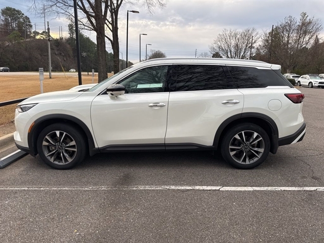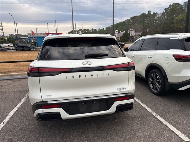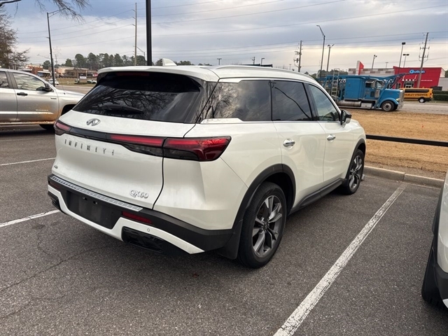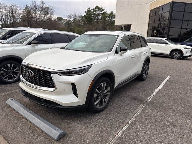 This 2023 INFINITI QX60 LUXE in Majestic White comes with the following features: 3.5L V6 9-Speed Automatic AWD *3rd Row Seating*, ***Manager Special - PRICE NOT A MISPRINT - THIS MONTH ONLY!!*, *Back Up Warning Sensors*, *Blind Spot Technology - Never Worry When Changing Lanes Again*, *Heated And Cooled Front Leather Seats*, *Panoramic Moonroof*, *Power Folding Mirrors*, *Rear View Back-Up Camera*, *Remote Start*, *We Deliver Anywhere*, and Apple Cargo Package (Cargo Mat (Reversible) and First Aid Kit), Performance Audio Package (Bose Performance Series 17-Speaker Sound System), Auto-dimming door mirrors, Brake assist, Garage door transmitter: HomeLink, Heated front seats, Heated steering wheel, Illuminated entry, Leather-Appointed Seating Surfaces, Navigation system: INFINITI InTouch Navigation, Power Liftgate, Power moonroof, Rain sensing wipers, Reclining 3rd row seat, Split folding rear seat, Ventilated front seats, and Wheels: 20`` x 8J Sporty Machined Aluminum Alloy Cargo Package (Cargo Mat (Reversible) and First Aid Kit), Performance Audio Package (Bose Performance Series 17-Speaker Sound System), INFINITI Certified Pre-Owned Certified, Auto-dimming door mirrors, Brake assist, Garage door transmitter: HomeLink, Heated front seats, Heated steering wheel, Illuminated entry, Leather-Appointed Seating Surfaces, Navigation system: INFINITI InTouch Navigation, Power Liftgate, Power moonroof, Rain sensing wipers, Reclining 3rd row seat, Split folding rear seat, Ventilated front seats, Wheels: 20`` x 8J Sporty Machined Aluminum Alloy, 3rd row seats: bench, 4-Wheel Disc Brakes, 4.334 Axle Ratio, 9 Speakers, ABS brakes, Air Conditioning, Alloy wheels, AM/FM radio: SiriusXM, Anti-whiplash front head restraints, Auto High-beam Headlights, Auto-dimming Rear-View mirror, Automatic temperature control, Bumpers: body-color, Climate-Controlled Front Bucket Seats, Delay-off headlights, Driver door bin, Driver vanity mirror, Dual front impact airbags, Dual front side impact airbags, Electronic Stability Control, Emergency communication system, Floor Mats on Bench Seats w/3rd Row Tray, Four wheel independent suspension, Front anti-roll bar, Front Bucket Seats, Front Center Armrest, Front dual zone A/C, Front reading lights, Fully automatic headlights, Heated door mirrors, Knee airbag, Leather Shift Knob, Leather steering wheel, Literature Kit, Low tire pressure warning, Memory seat, Occupant sensing airbag, Outside temperature display, Overhead airbag, Overhead console, Panic alarm, Passenger door bin, Passenger vanity mirror, Power door mirrors, Power driver seat,