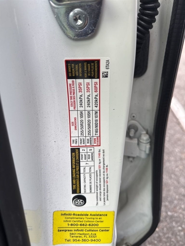 *3rd Row Seating*, ***Manager Special - PRICE NOT A MISPRINT - THIS MONTH ONLY!!*, *Back Up Warning Sensors*, *Blind Spot Technology - Never Worry When Changing Lanes Again*, *Heated And Cooled Front Leather Seats*, *Panoramic Moonroof*, *Power Folding Mirrors*, *Rear View Back-Up Camera*, *Remote Start*, *We Deliver Anywhere*, Apple, Auto-dimming door mirrors, Bose Performance Series 17-Speaker Sound System, Brake assist, Cargo Mat (Reversible), Cargo Package, First Aid Kit, Garage door transmitter: HomeLink, Heated front seats, Heated steering wheel, Illuminated entry, Leather-Appointed Seating Surfaces, Navigation system: INFINITI InTouch Navigation, Performance Audio Package, Power Liftgate, Power moonroof, Rain sensing wipers, Reclining 3rd row seat, Split folding rear seat, Ventilated front seats, Wheels: 20`` x 8J Sporty Machined Aluminum Alloy.