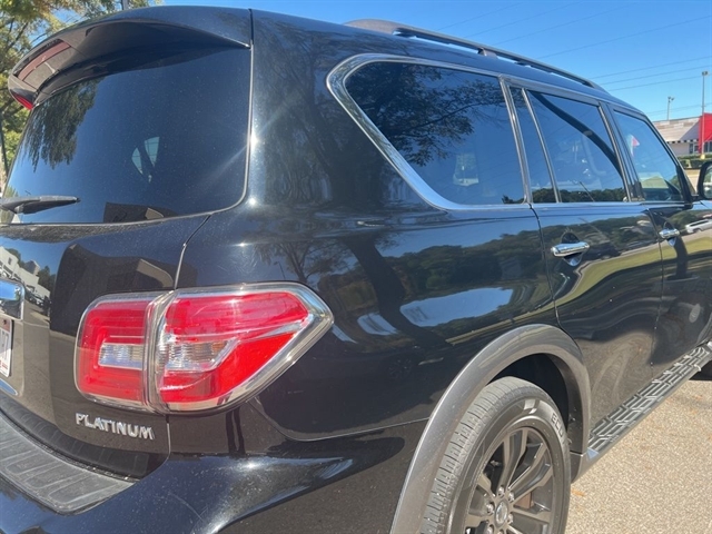 This 2017 Nissan Armada Platinum in Super Black comes with the following features: 5.6L V8 DOHC 32V Endurance 7-Speed Automatic RWD 13 Speakers, 2.937 Axle Ratio, 2nd & 3rd Row Carpeted Mats, 3rd row seats: split-bench, 4-Wheel Disc Brakes, A/V remote, ABS brakes, Activation Disclaimer, Air Conditioning, Alloy wheels, AM/FM radio: SiriusXM, Anti-whiplash front head restraints, Auto tilt-away steering wheel, Auto-dimming door mirrors, Auto-dimming Rear-View mirror, Auto-leveling suspension, Automatic temperature control, Brake assist, Bumpers: body-color, Cargo Area Protector, Cargo Net & First Aid Kit, CD player, Delay-off headlights, Driver door bin, Driver vanity mirror, Dual front impact airbags, Dual front side impact airbags, Electronic Stability Control, Four wheel independent suspension, Front anti-roll bar, Front Bucket Seats, Front Center Armrest, Front dual zone A/C, Front fog lights, Front reading lights, Fully automatic headlights, Garage door transmitter: HomeLink, Headphones, Heated & Cooled Front Bucket Seats, Heated door mirrors, Heated front seats, Heated rear seats, Heated steering wheel, Illuminated entry, Illuminated Kick Plates, Lane Departure Warning System, Leather Shift Knob, Leather-Appointed Seat Trim, Low tire pressure warning, Memory seat, Navigation System, Occupant sensing airbag, Outside temperature display, Overhead airbag, Overhead console, Panic alarm, Passenger door bin, Passenger vanity mirror, Power door mirrors, Power driver seat, Power Liftgate, Power moonroof, Power passenger seat, Power steering, Power windows, Radio data system, Radio: Bose AM/FM/SXM/CD/MP3 Audio System, Rain sensing wipers, Rear air conditioning, Rear anti-roll bar, Rear reading lights, Rear seat center armrest, Rear window defroster, Rear window wiper, Reclining 3rd row seat, Remote keyless entry, Roof rack: rails only, Roof Rail Cross Bars, Security system, Speed control, Speed-sensing steering, Speed-Sensitive Wipers, Split folding rear seat, Steering wheel mounted audio controls, Tachometer, Telescoping steering wheel, Tilt steering wheel, TPMS Activation, Traction control, Trip computer, Turn signal indicator mirrors, USB Charging Ports, Variably intermittent wipers, Ventilated front seats, Voltmeter, and Wheels: 20`` Machine-Faced Chrome w/Tinted CC.